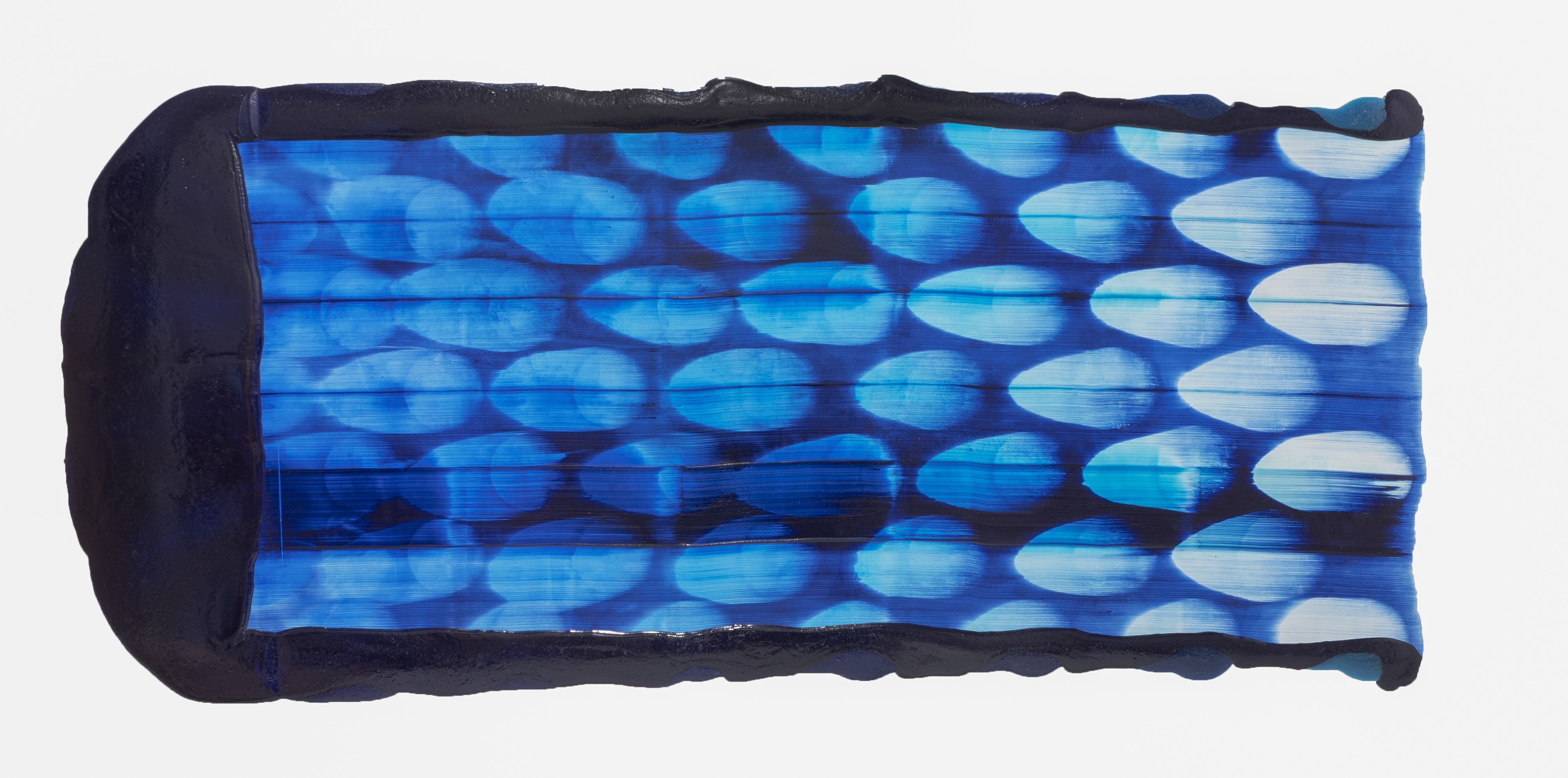 I may have jumped ahead too quickly; let us look more carefully at Katsuki’s expression. Her expression which may be characterised by the intonated brushstrokes utilising deep blue paint, is realised through a serial elaborate preparation. After creating a thick coloured plane of paints subtly varying in brightness from white to deep blue on the canvas, hypothesising the final icon, she then moves the mass of paints in one stroke from top to bottom leaving brush marks, using brushes installed in a row, to create the flowing brushstroke. This irreversible process creates an incidental pattern, which Katsuki even predicts that might turn out to be very different from the icon she imagines. As this sort of contingency is induced, unpredictable forms make their appearance, allowing the viewer and even the artist to interpret anything and everything.