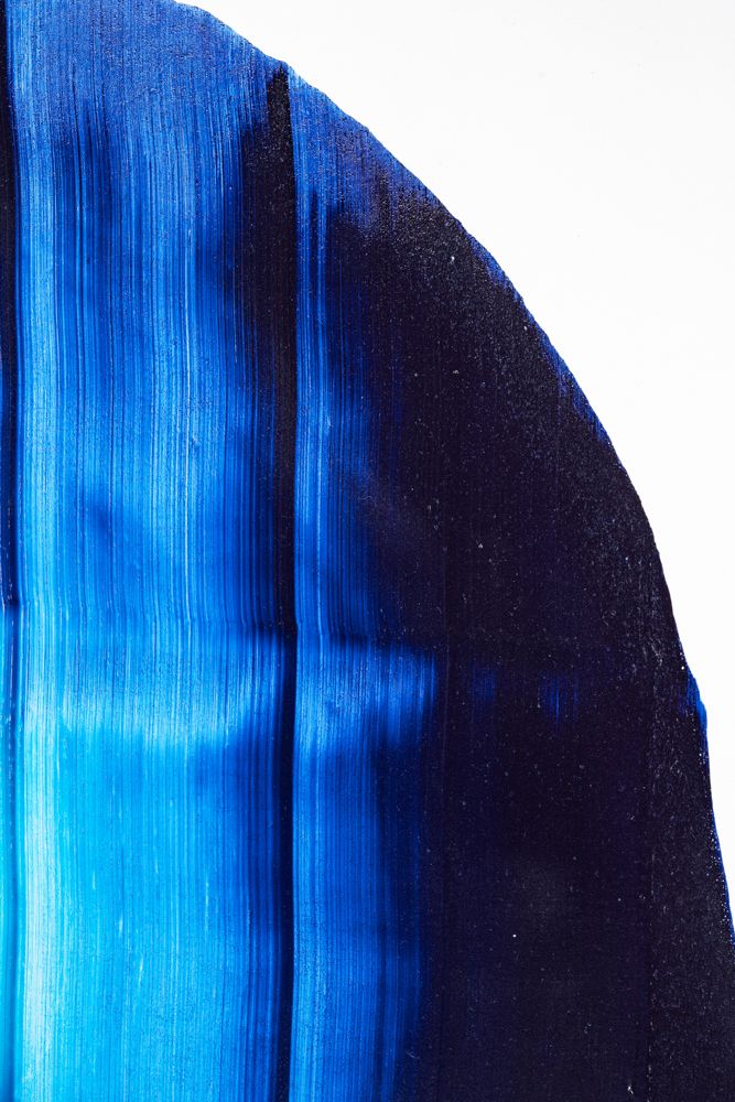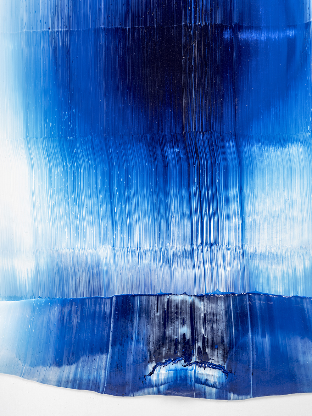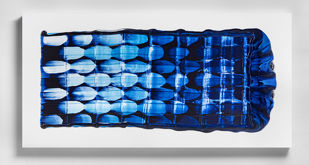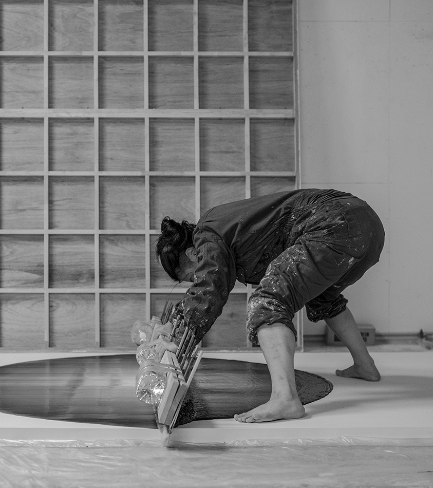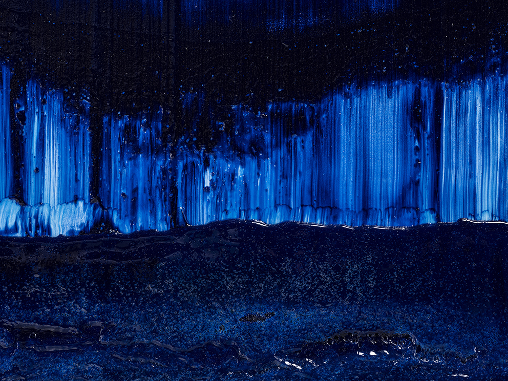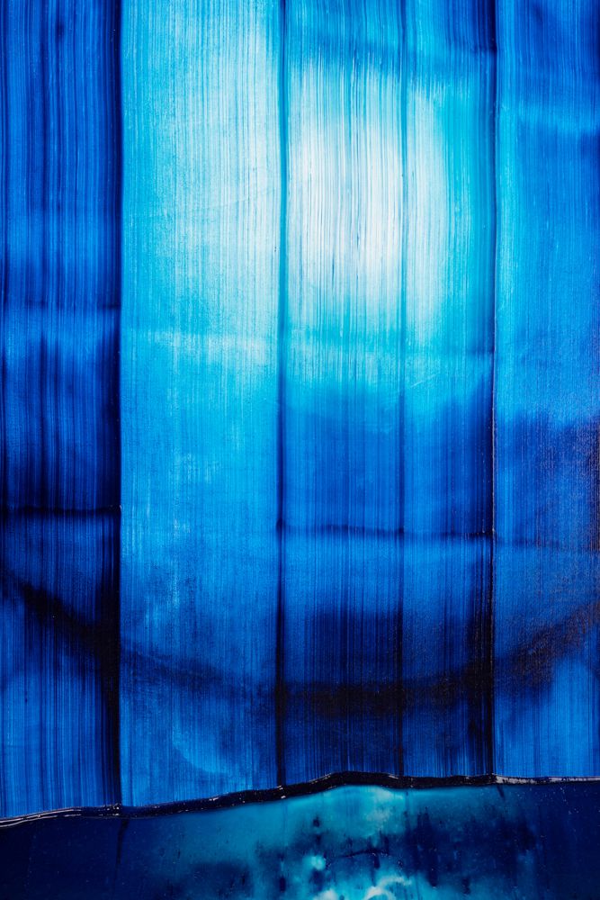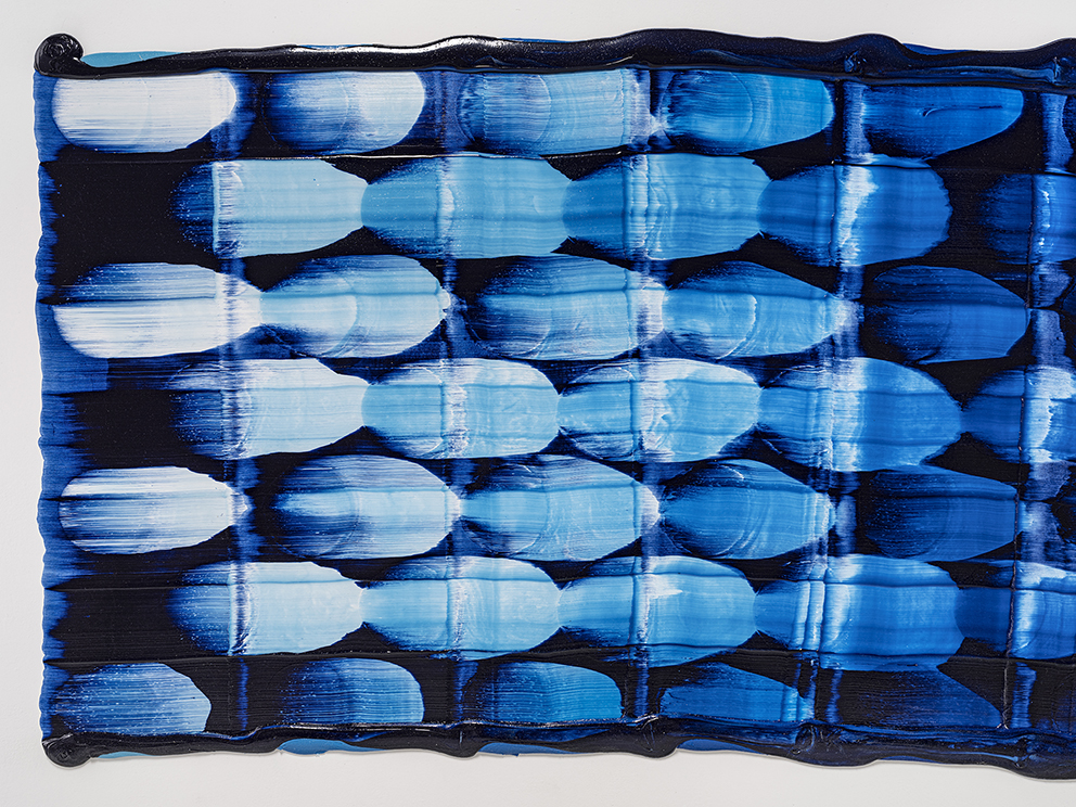 I may have jumped ahead too quickly; let us look more carefully at Katsuki’s expression. Her expression which may be characterised by the intonated brushstrokes utilising deep blue paint, is realised through a serial elaborate preparation. After creating a thick coloured plane of paints subtly varying in brightness from white to deep blue on the canvas, hypothesising the final icon, she then moves the mass of paints in one stroke from top to bottom leaving brush marks, using brushes installed in a row, to create the flowing brushstroke. This irreversible process creates an incidental pattern, which Katsuki even predicts that might turn out to be very different from the icon she imagines. As this sort of contingency is induced, unpredictable forms make their appearance, allowing the viewer and even the artist to interpret anything and everything.