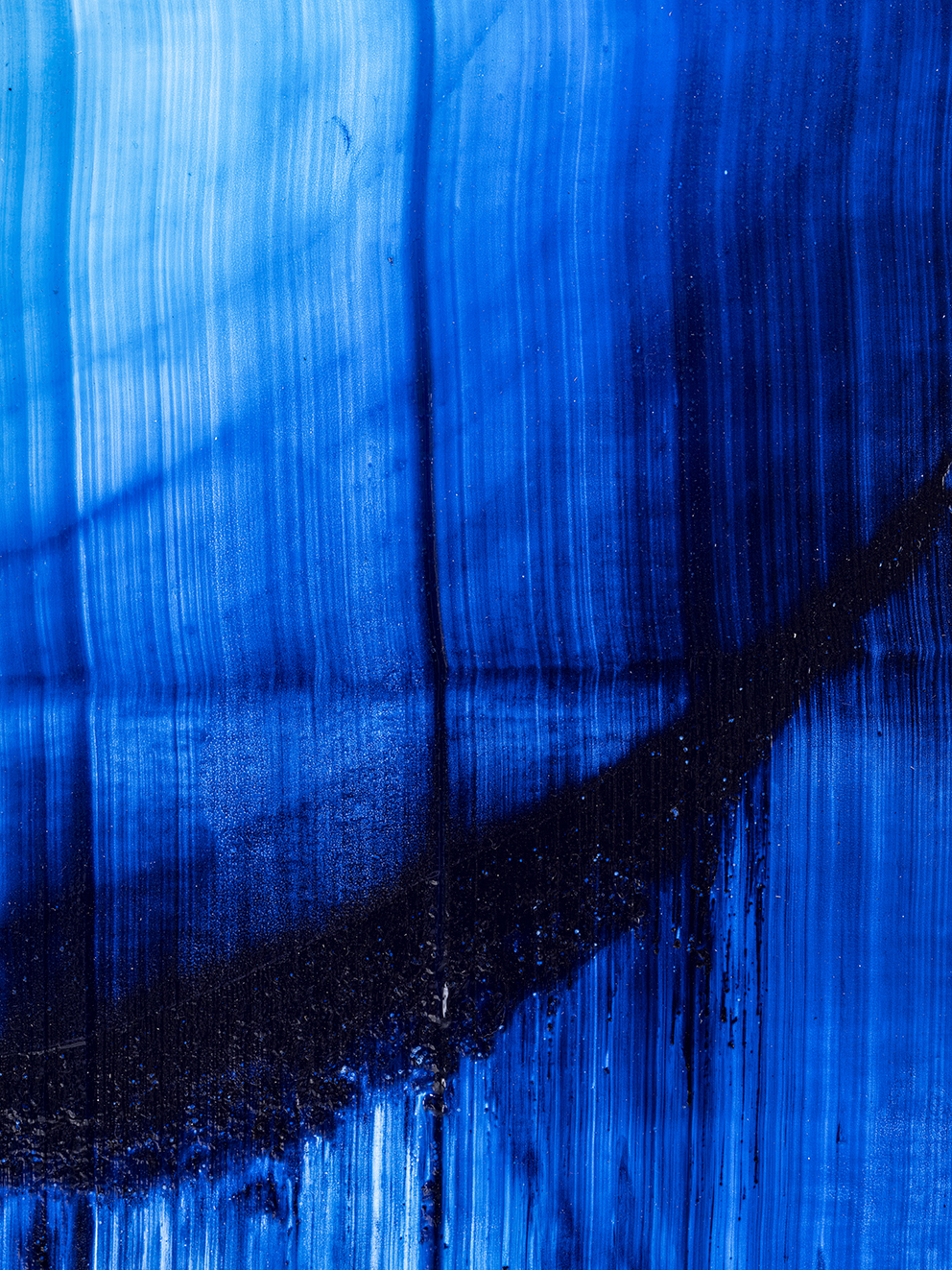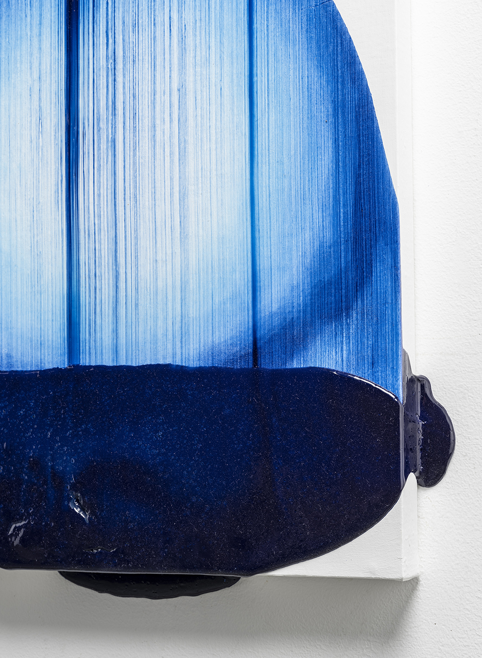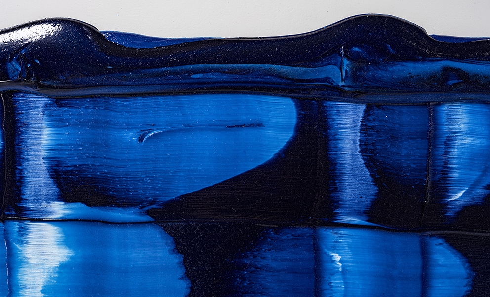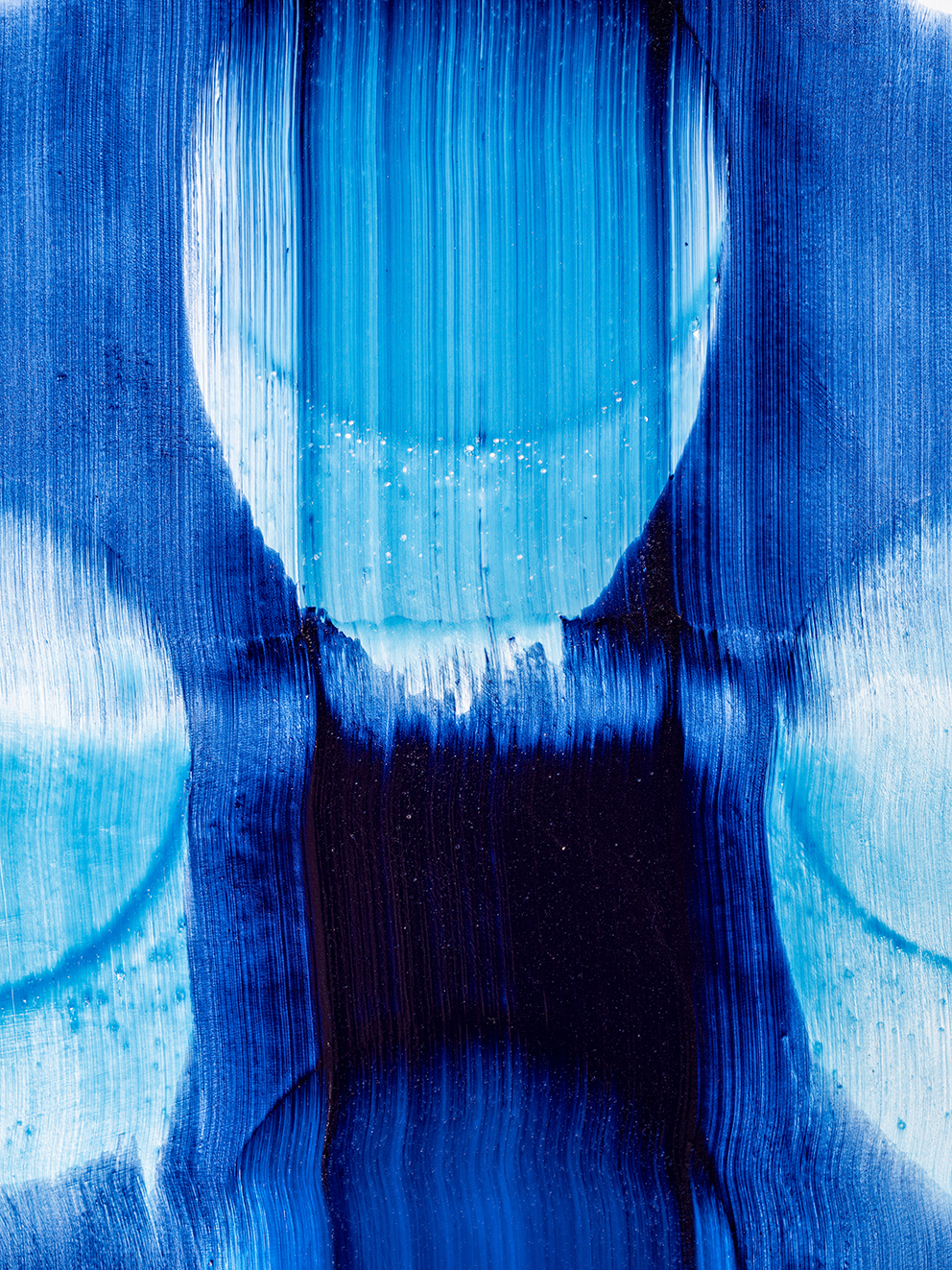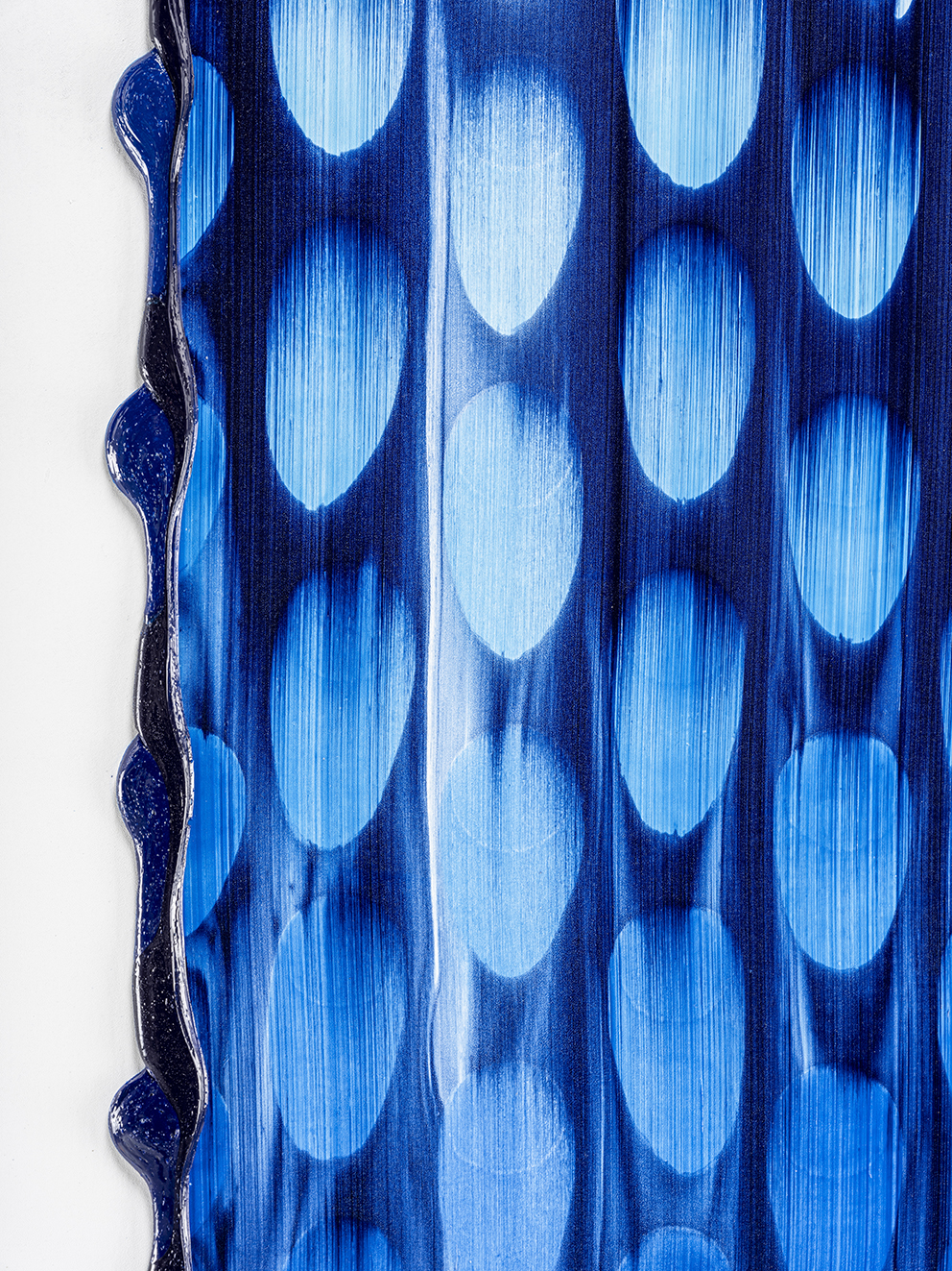 I may have jumped ahead too quickly; let us look more carefully at Katsuki’s expression. Her expression which may be characterised by the intonated brushstrokes utilising deep blue paint, is realised through a serial elaborate preparation. After creating a thick coloured plane of paints subtly varying in brightness from white to deep blue on the canvas, hypothesising the final icon, she then moves the mass of paints in one stroke from top to bottom leaving brush marks, using brushes installed in a row, to create the flowing brushstroke. This irreversible process creates an incidental pattern, which Katsuki even predicts that might turn out to be very different from the icon she imagines. As this sort of contingency is induced, unpredictable forms make their appearance, allowing the viewer and even the artist to interpret anything and everything.