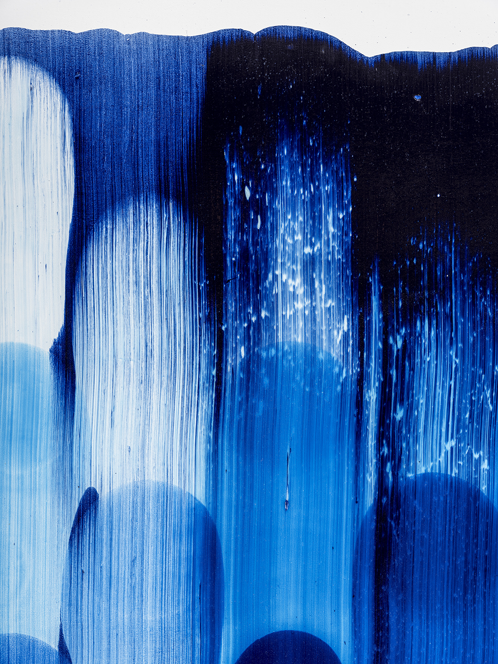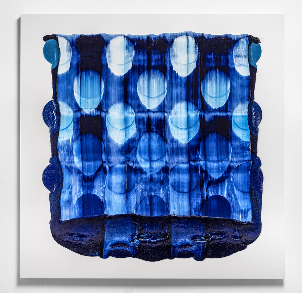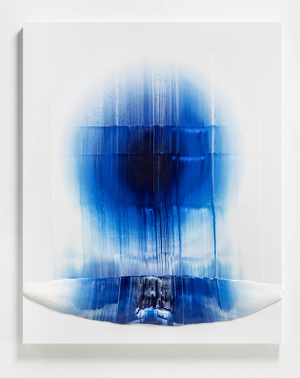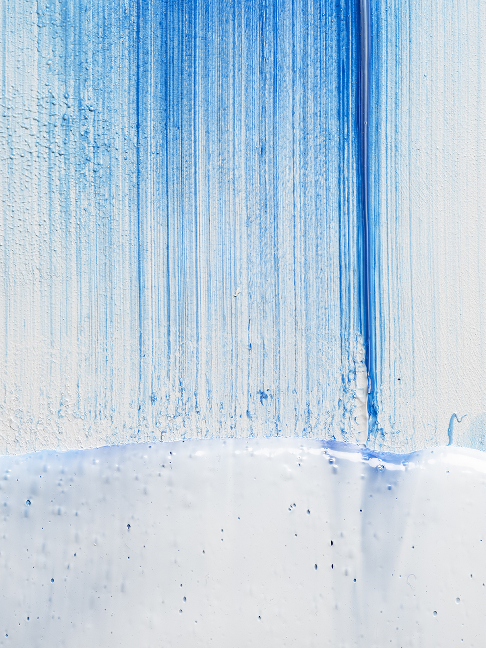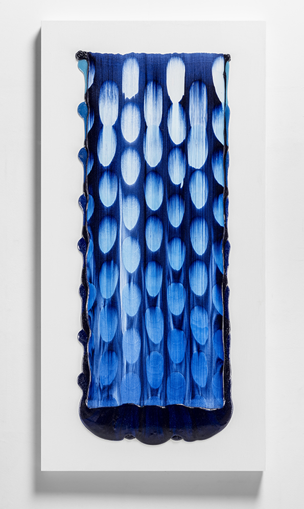 I may have jumped ahead too quickly; let us look more carefully at Katsuki’s expression. Her expression which may be characterised by the intonated brushstrokes utilising deep blue paint, is realised through a serial elaborate preparation. After creating a thick coloured plane of paints subtly varying in brightness from white to deep blue on the canvas, hypothesising the final icon, she then moves the mass of paints in one stroke from top to bottom leaving brush marks, using brushes installed in a row, to create the flowing brushstroke. This irreversible process creates an incidental pattern, which Katsuki even predicts that might turn out to be very different from the icon she imagines. As this sort of contingency is induced, unpredictable forms make their appearance, allowing the viewer and even the artist to interpret anything and everything.