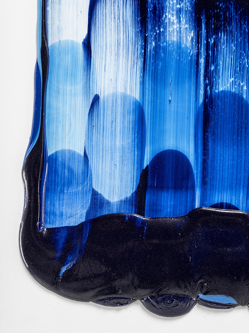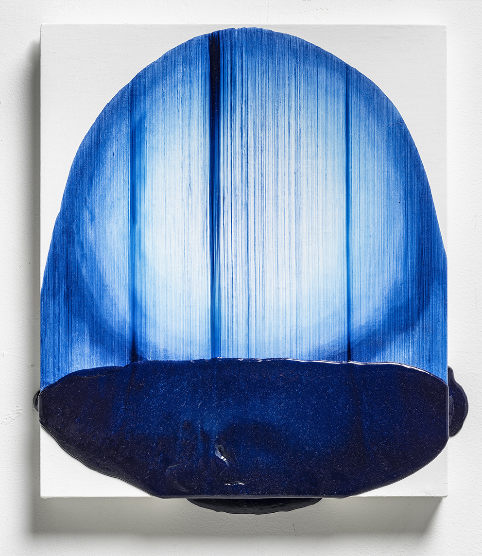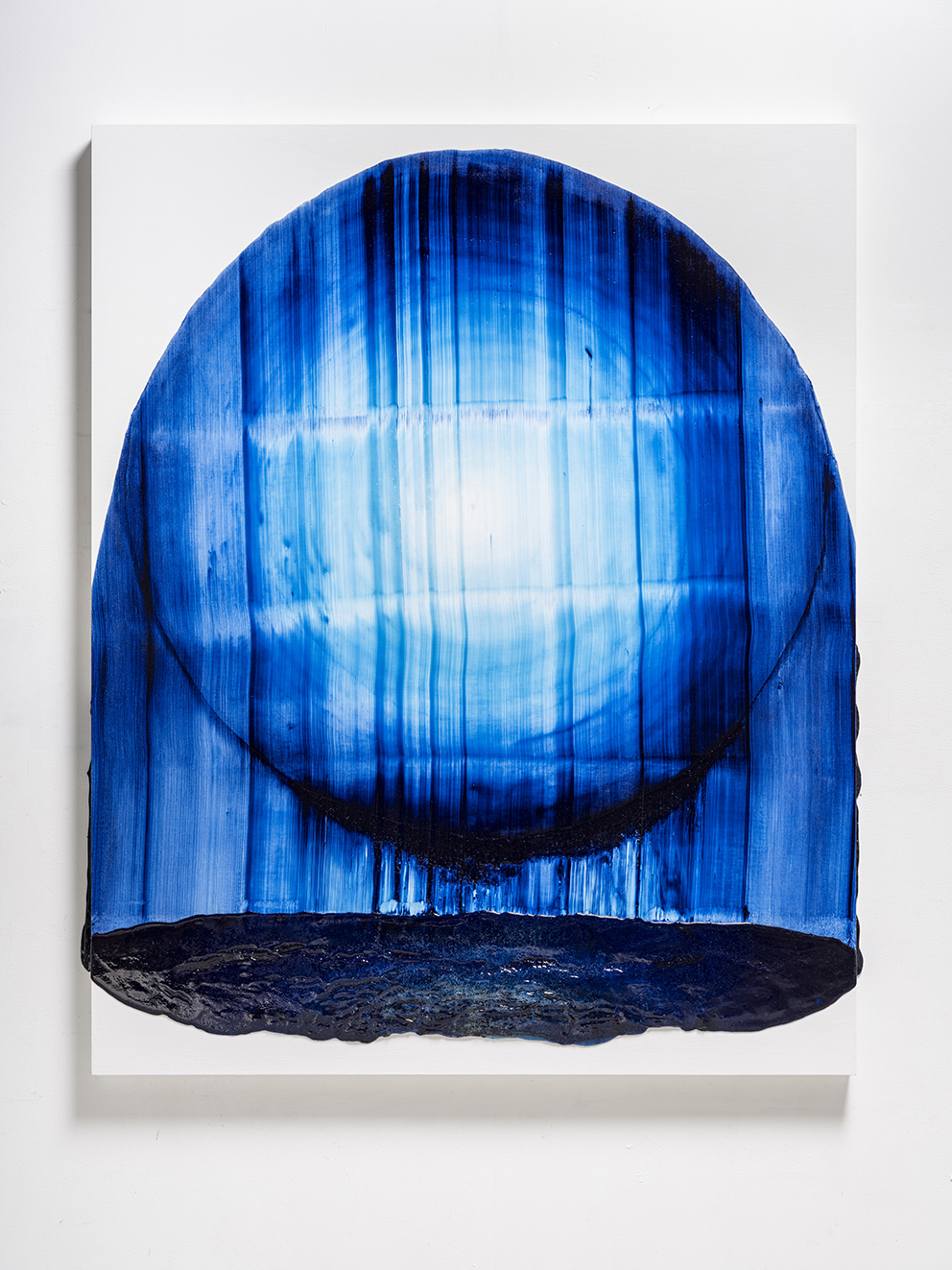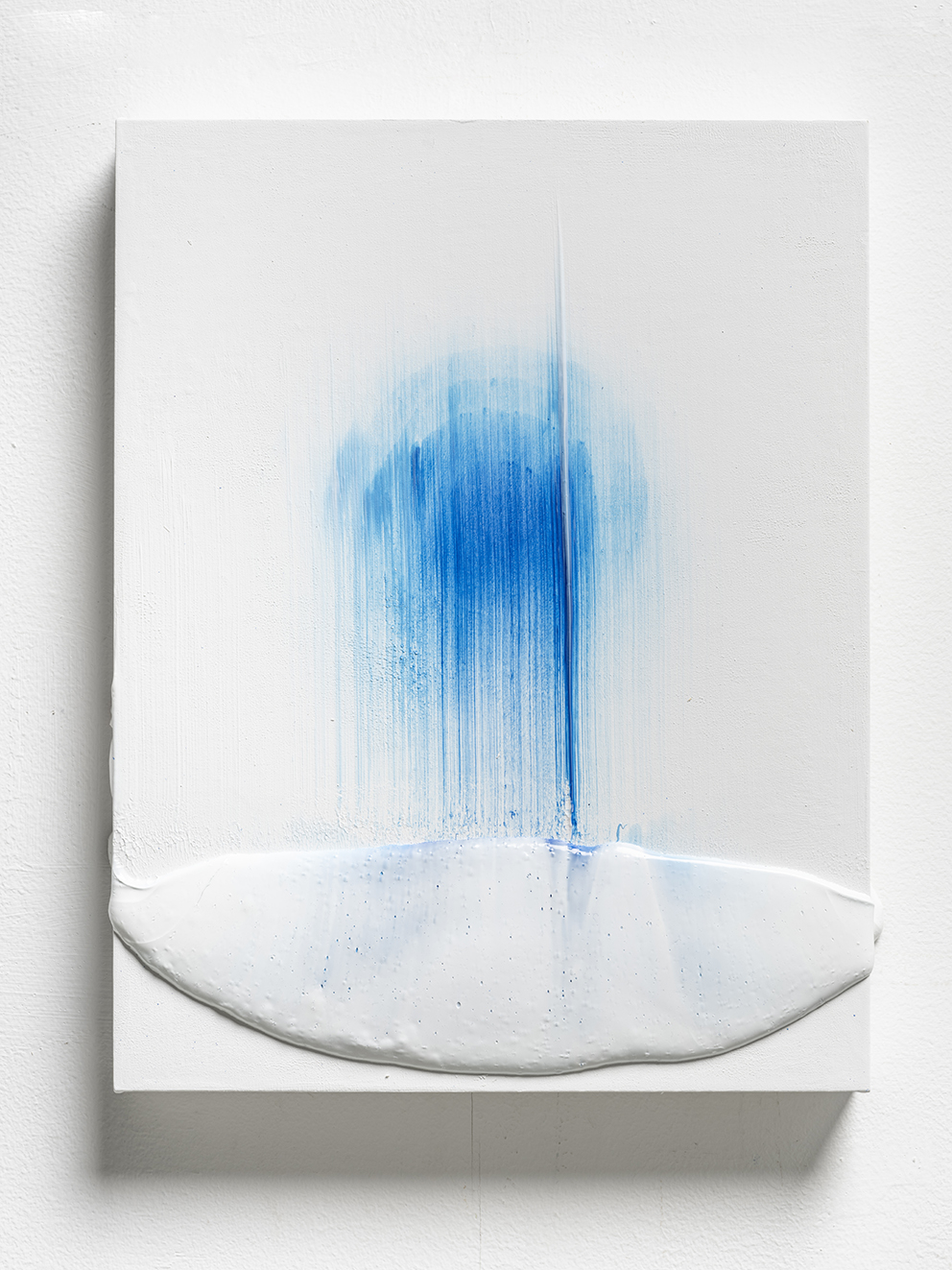 I may have jumped ahead too quickly; let us look more carefully at Katsuki’s expression. Her expression which may be characterised by the intonated brushstrokes utilising deep blue paint, is realised through a serial elaborate preparation. After creating a thick coloured plane of paints subtly varying in brightness from white to deep blue on the canvas, hypothesising the final icon, she then moves the mass of paints in one stroke from top to bottom leaving brush marks, using brushes installed in a row, to create the flowing brushstroke. This irreversible process creates an incidental pattern, which Katsuki even predicts that might turn out to be very different from the icon she imagines. As this sort of contingency is induced, unpredictable forms make their appearance, allowing the viewer and even the artist to interpret anything and everything.