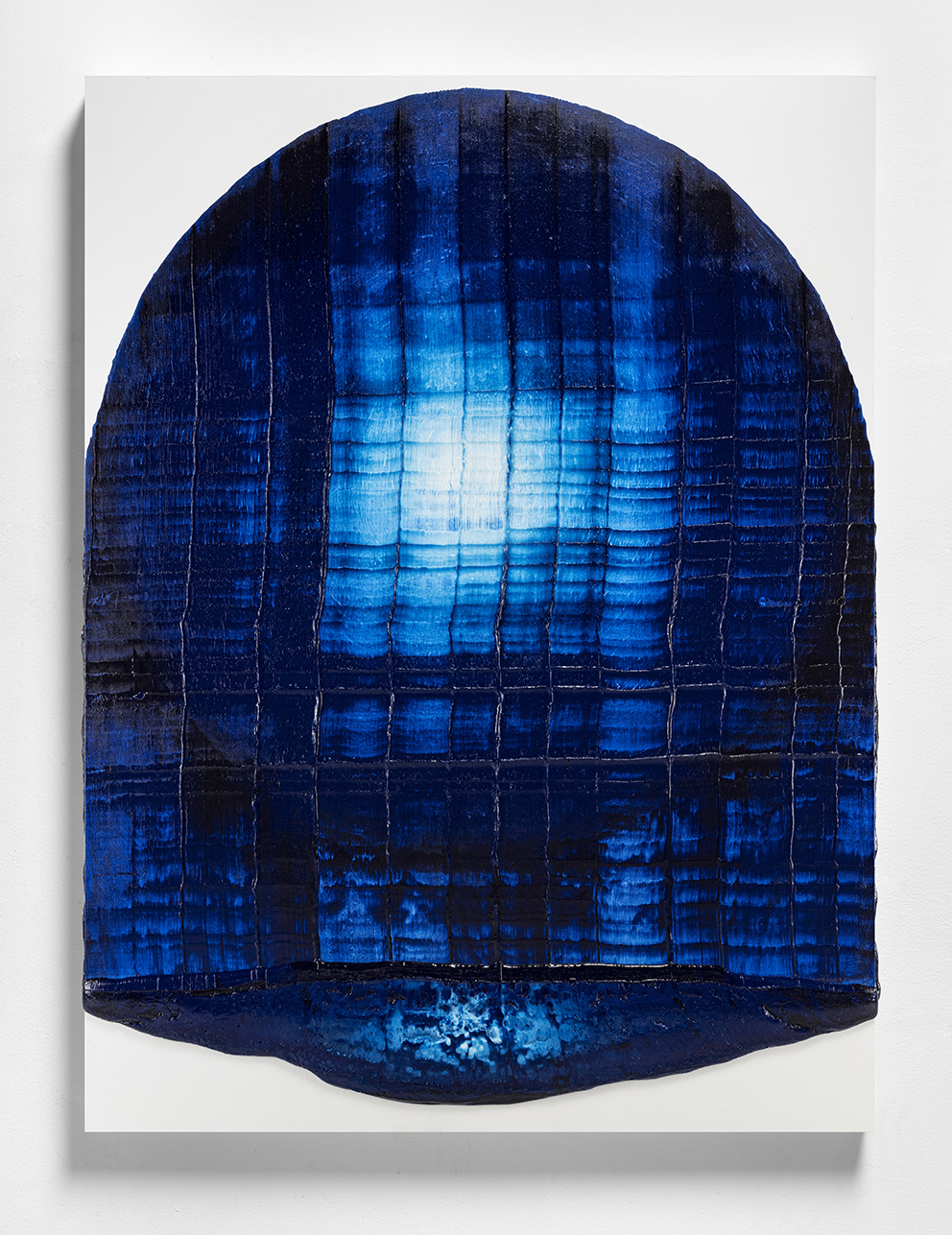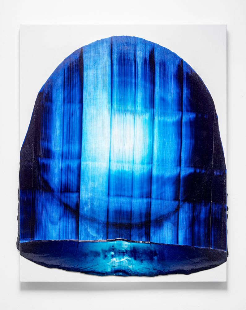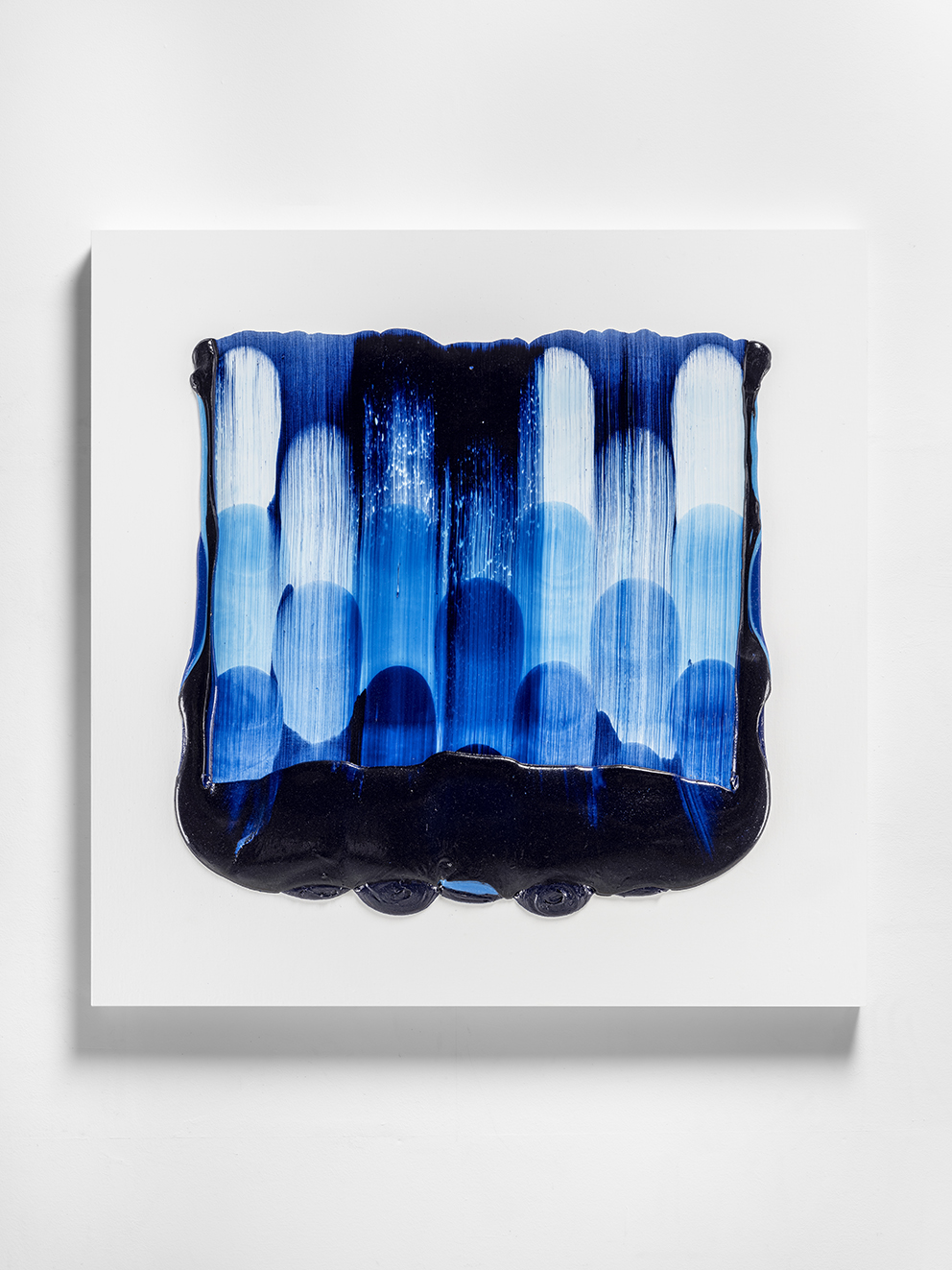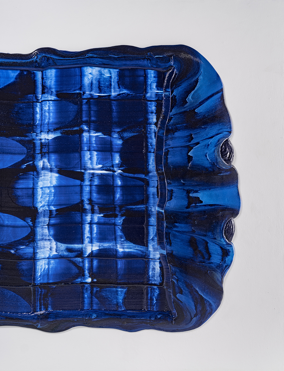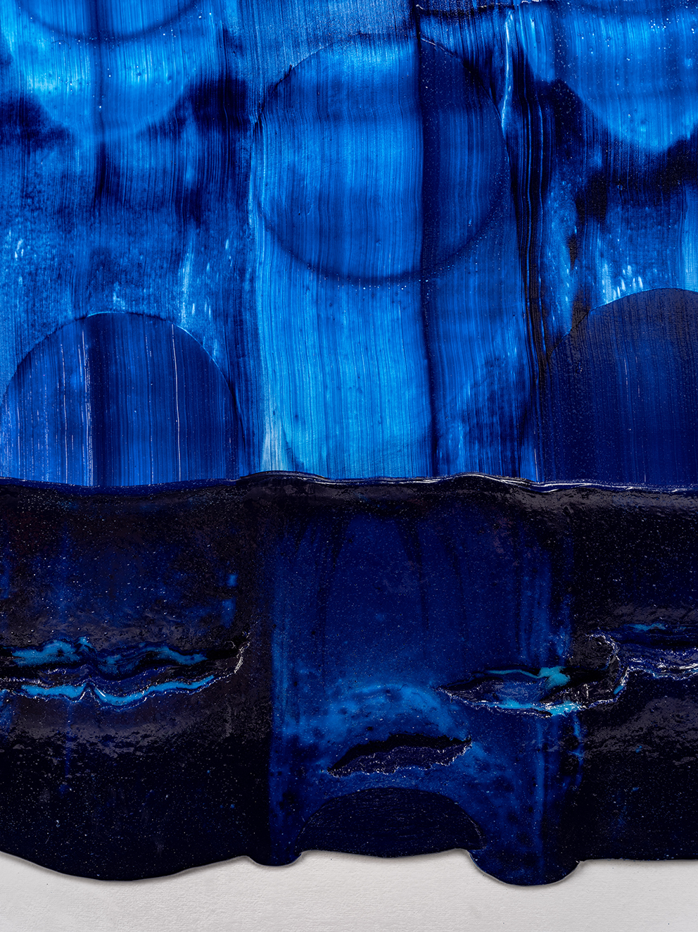 I may have jumped ahead too quickly; let us look more carefully at Katsuki’s expression. Her expression which may be characterised by the intonated brushstrokes utilising deep blue paint, is realised through a serial elaborate preparation. After creating a thick coloured plane of paints subtly varying in brightness from white to deep blue on the canvas, hypothesising the final icon, she then moves the mass of paints in one stroke from top to bottom leaving brush marks, using brushes installed in a row, to create the flowing brushstroke. This irreversible process creates an incidental pattern, which Katsuki even predicts that might turn out to be very different from the icon she imagines. As this sort of contingency is induced, unpredictable forms make their appearance, allowing the viewer and even the artist to interpret anything and everything.